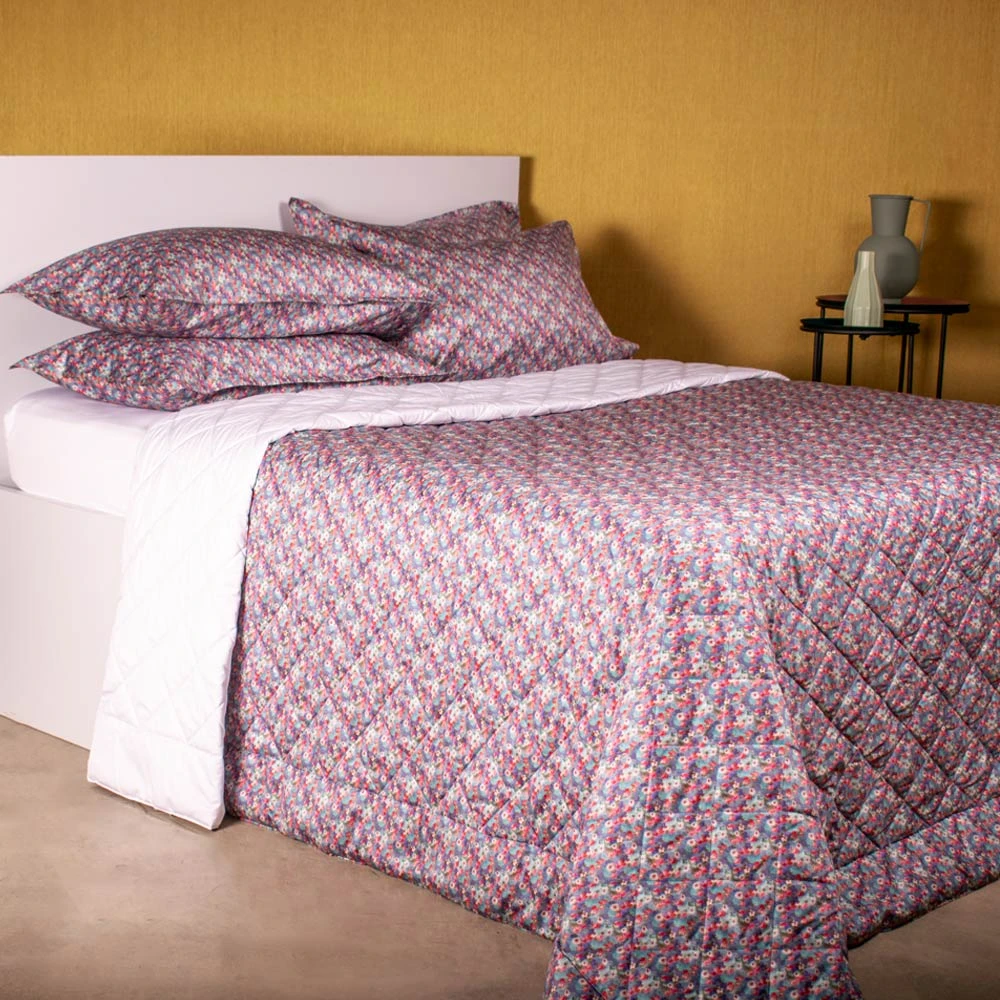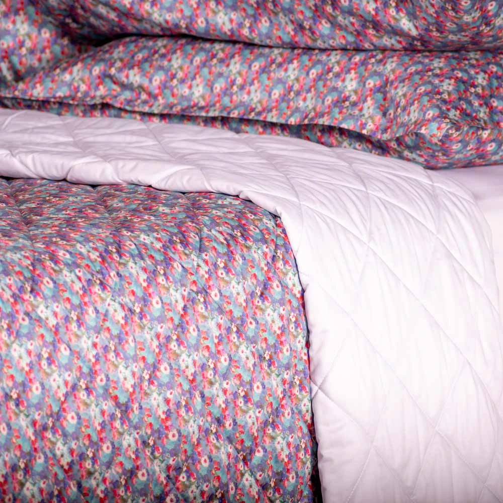 Les couettes Ninfea se distinguent par leur ravissant motif floral, comme celui visible sur l’image : une explosion de petits pétales aux couleurs vives, du rose au fuchsia, du bleu ciel au turquoise, ponctuée de touches de blanc et de violet. Ce motif, à la fois vibrant et délicat, évoque un champ de fleurs ou une étendue d’eau parsemée de nénuphars. Chaque ensemble est confectionné dans un satin de pur coton d’exception, choisi pour sa douceur incomparable, sa légèreté et sa remarquable respirabilité. Une sensation caressante sur la peau, idéale pour favoriser un sommeil profond et réparateur, quelle que soit la saison.