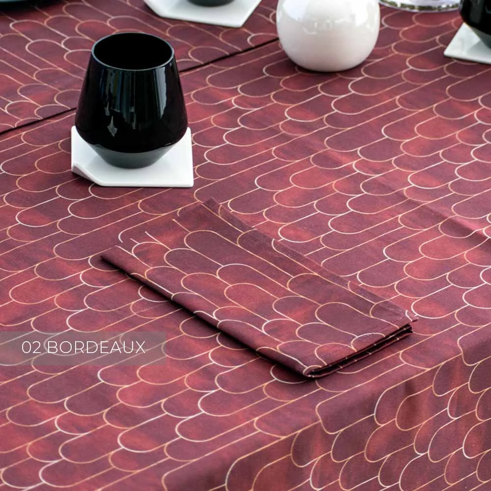 Créez votre ensemble coordonné de nappe, chemin de table, serviettes et sets de table américains. Personnalisez avec les mesures et les couleurs de votre choix !